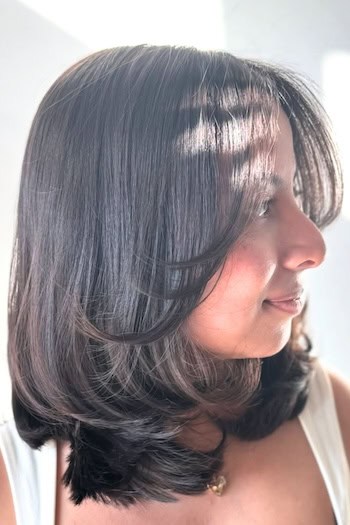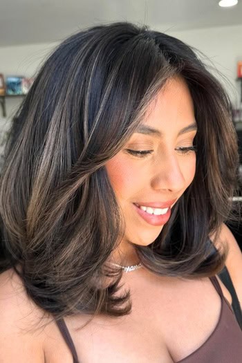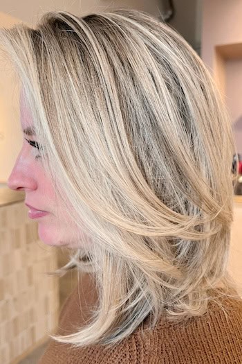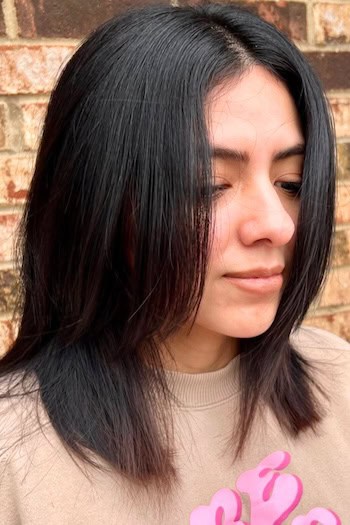 Falling just at the shoulders, the layers add texture, volume, and a natural bounce which makes the hair look fuller and more dynamic. This length is perfect for both straight and wavy styles which allows for sleek, polished looks or relaxed, tousled waves.