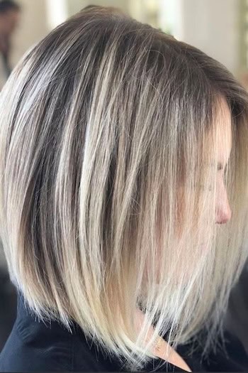 Platinum shoulder-length A-line bob is a striking and modern hairstyle that makes a bold statement. With a slightly longer front and shorter back, the A-line cut creates a sharp, angled silhouette that flatters the face. Platinum tones add brightness and a sleek, edgy vibe which enhances the overall look.