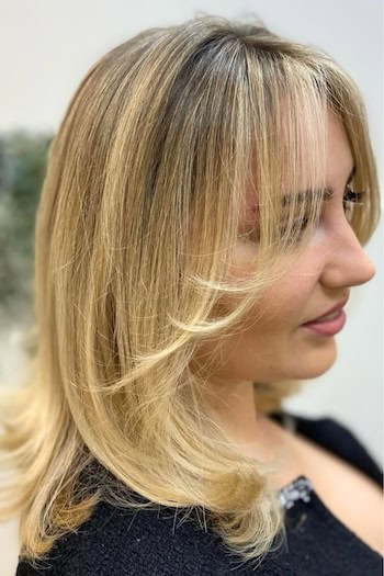 The shoulder-length honey blonde layered bob is a warm and stylish hairstyle that flatters every face shape. The honey blonde tones bring a soft, sun-kissed glow which adds warmth and dimension. Whether worn sleek and polished or with loose, effortless waves, this layered bob offers a modern, chic, and low-maintenance style.