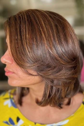 The shoulder-length layered bob with highlights is a stylish and versatile haircut that adds dimension and depth to your hair. Layers create movement and texture which gives the hair a fuller, more dynamic look while highlights add brightness and a sun-kissed glow. This length is easy to manage and suits all face shapes.
