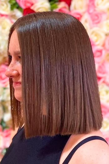 The shoulder-length sleek blunt lob is a modern and polished hairstyle that exudes sophistication. The blunt cut creates a sharp, clean silhouette while giving the hair a bold and structured look. Its sleek finish enhances shine and elegance while making it perfect for a professional or chic everyday style.