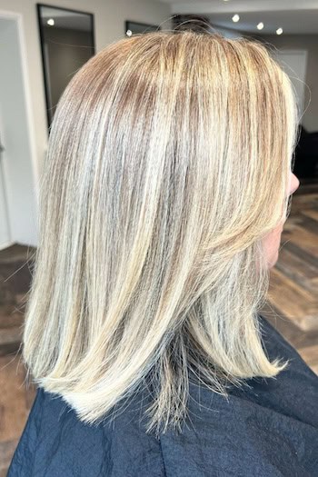 The straight shoulder-length blonde lob with highlights is a sleek and modern hairstyle. Falling just at the shoulders, this lob features a smooth, polished finish that exudes sophistication. Blonde highlights add depth, dimension, and a sun-kissed glow which enhancesthe overall shine and movement of the hair.