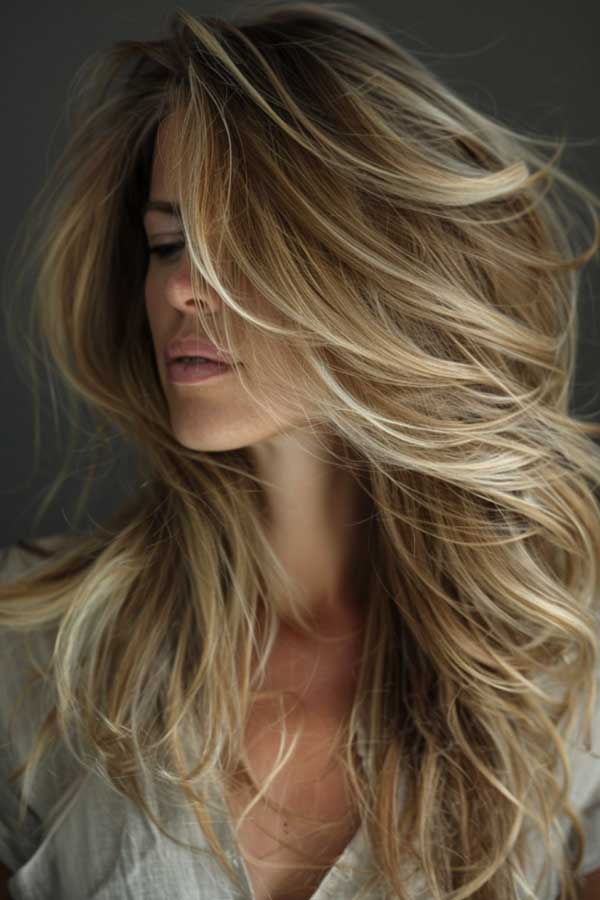 Sandy blonde hair with caramel lowlights creates a warm, sun-kissed look that’s effortlessly natural. The soft beige base blends beautifully with rich caramel tones, adding depth and dimension. This combo enhances texture and flatters a variety of skin tones, giving the hair a multidimensional glow. It’s perfect for anyone wanting a low-maintenance, beachy vibe with a touch of warmth and sophistication. The result is chic, fresh, and full of movement.
