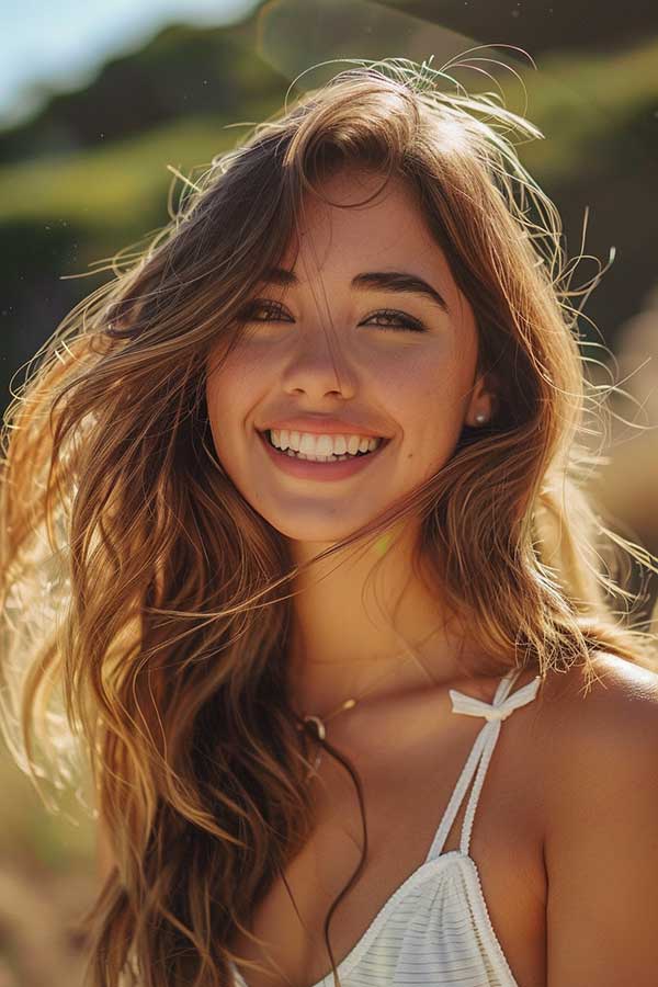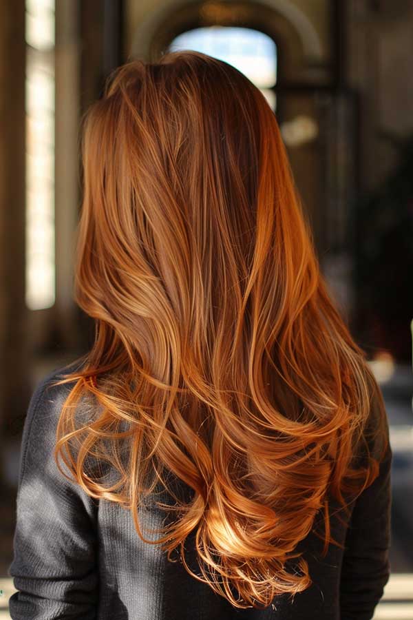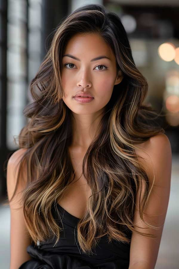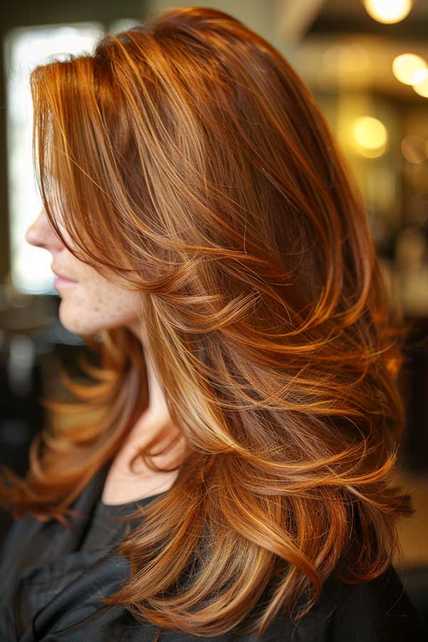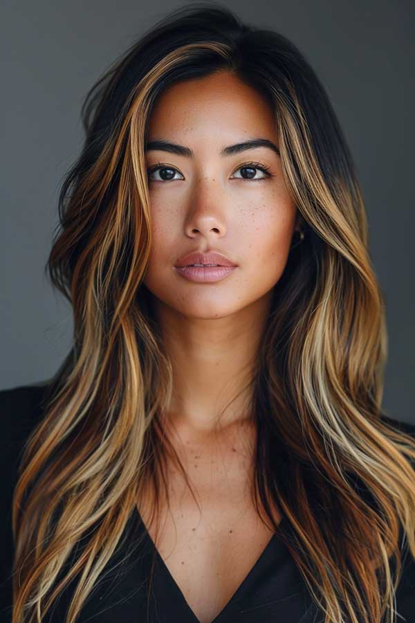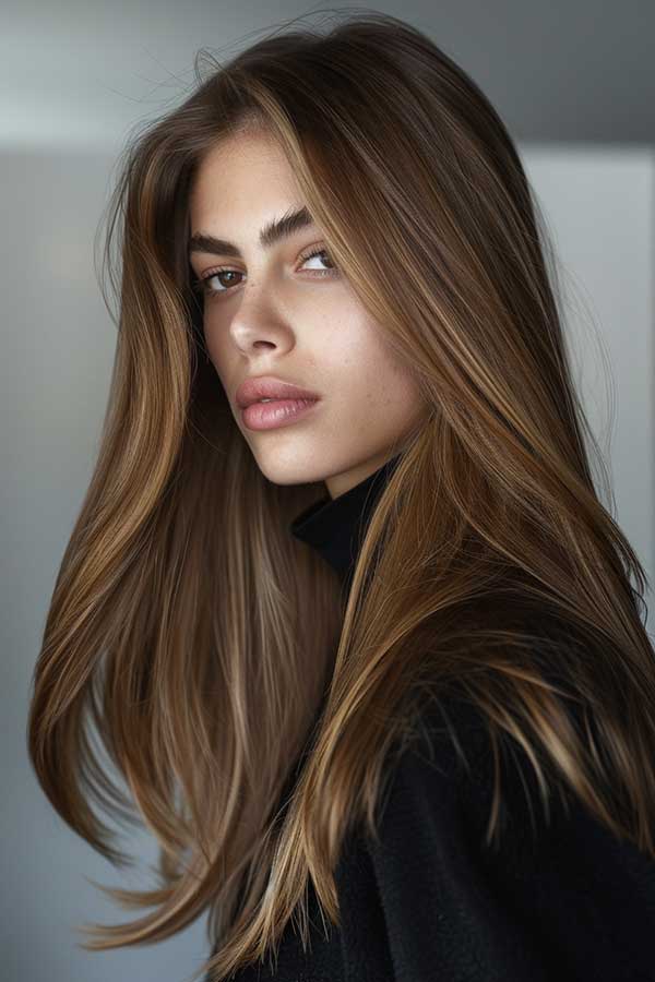 Caramel highlights on layered hair create a beautiful, multi-dimensional look. The warm caramel tones brighten the hair, adding depth and enhancing the layers’ natural texture. This combination brings out movement, making the hair appear fuller and more voluminous. Ideal for both straight and wavy hair, caramel highlights provide a sun-kissed glow that complements any style. It’s a low-maintenance, chic choice that adds warmth and sophistication to layered cuts.