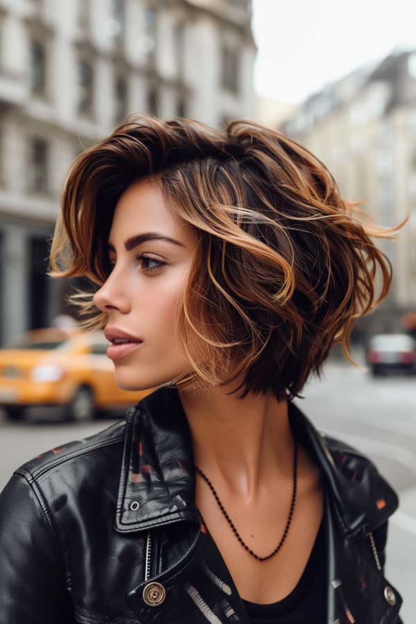 Caramel balayage on short hair creates a vibrant, dimensional look, adding warmth and depth to the cut. The soft caramel highlights blend seamlessly with the base color, enhancing the texture and movement of the shorter strands. This style brightens the hair without overwhelming it, offering a fresh, sun-kissed glow. Perfect for adding a chic, low-maintenance update, caramel balayage on short hair provides a modern and stylish finish for any occasion.