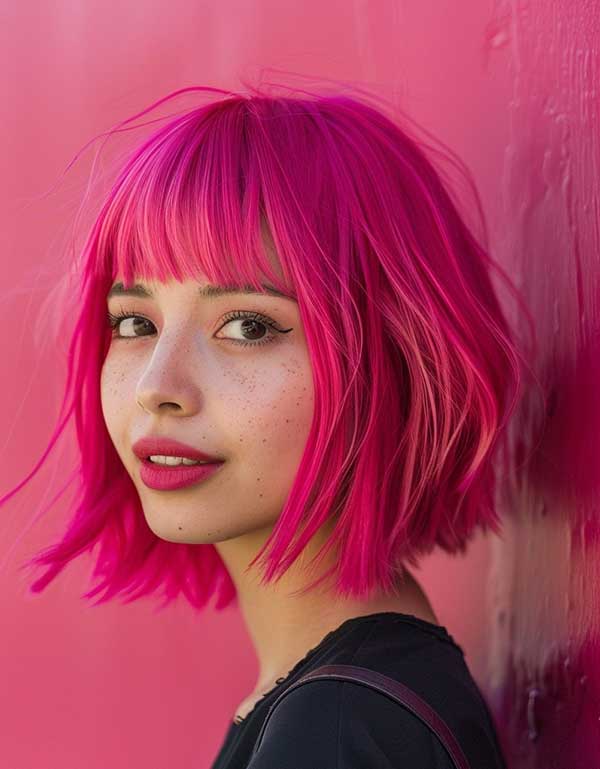 The hot pink bob with bangs is a daring hairstyle that stands out instantly. The bright pink color brings vibrant energy while the clean bob cut keeps it chic and contemporary. This look is ideal for anyone ready to make a bold statement while combining sleek sophistication with a fun and fearless splash of color.