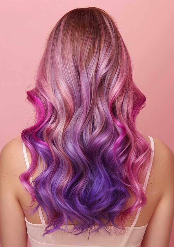 Pink and purple ombre on curly hair creates a vibrant look full of personality. The smooth gradient from bright pink to rich purple adds depth and dimension which enhances the natural texture of curls. This playful color combination brings a fun, bold vibe while highlighting the hair’s movement and bounce.