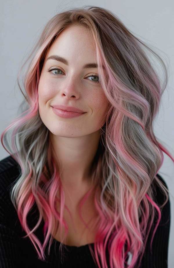 Pink highlights on gray hair add a fresh and modern twist to natural silver tones. The soft pink accents create a beautiful contrast which brings warmth and vibrancy to the gray base. Perfect for those embracing their gray while wanting a splash of color.