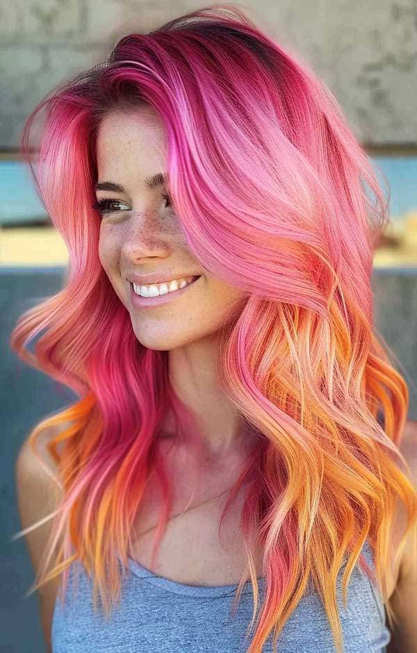 Pink and orange ombre hair creates a fiery gradient that’s full of energy and warmth. The seamless blend from vibrant pink to bright orange delivers a tropical vibe that instantly grabs attention. This colorful transition highlights movement and adds depth while making it perfect for those who want an eye-catching look.