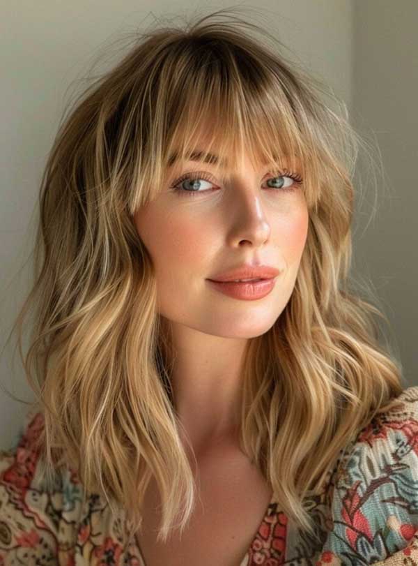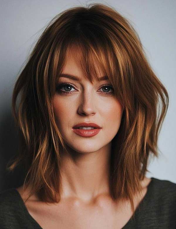Choppy shoulder-length hair with bangs brings an edgy, textured vibe to a classic cut. The uneven, layered ends create movement and volume while the bangs add a playful, face-framing element. It’s ideal for those who want a low-maintenance hairstyle that adds personality and flair to everyday wear.