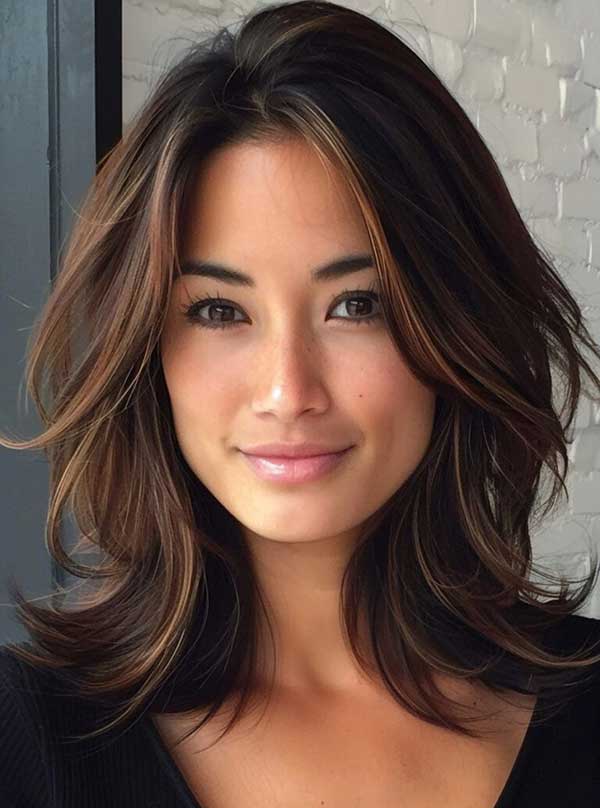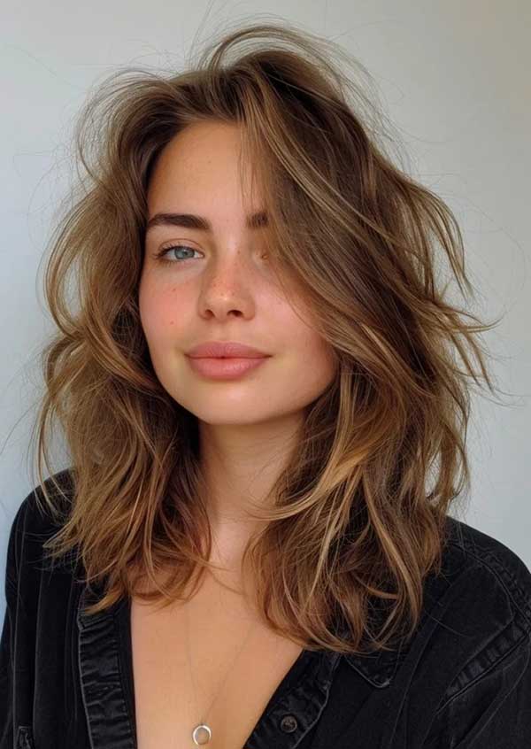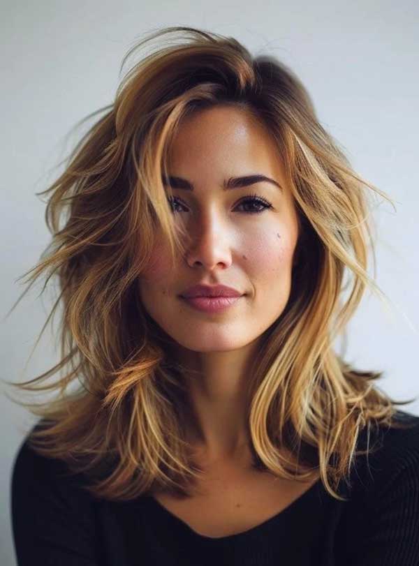 Shoulder-length wispy layers create a light, textured look that’s effortlessly stylish. The soft feathered layers add movement and dimension while giving the hair a breezy, natural flow. It’s a great choice for anyone seeking a fresh, modern haircut with a soft and feminine finish.