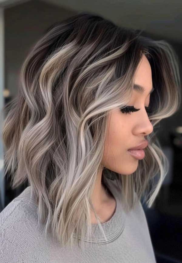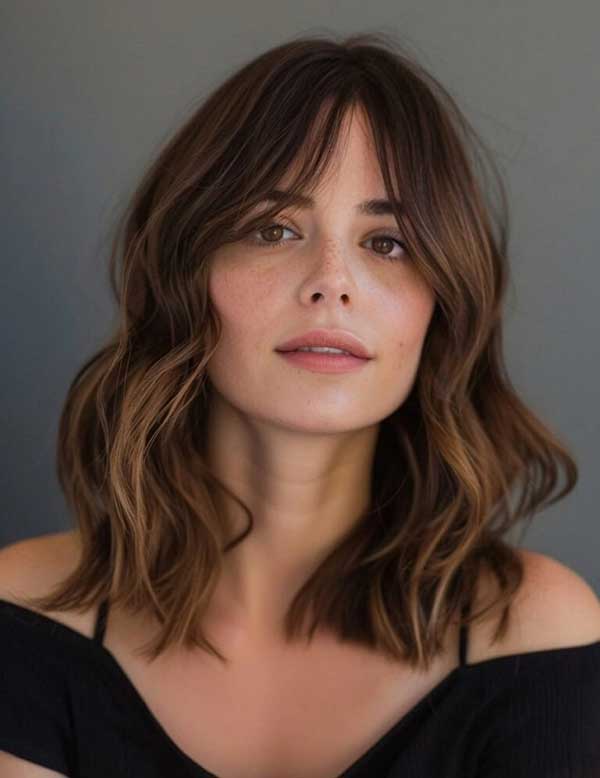 A wavy lob with side-swept bangs is the perfect blend of softness and style. The loose waves add texture and volume while the angled bangs frame the face for a flattering, romantic touch.