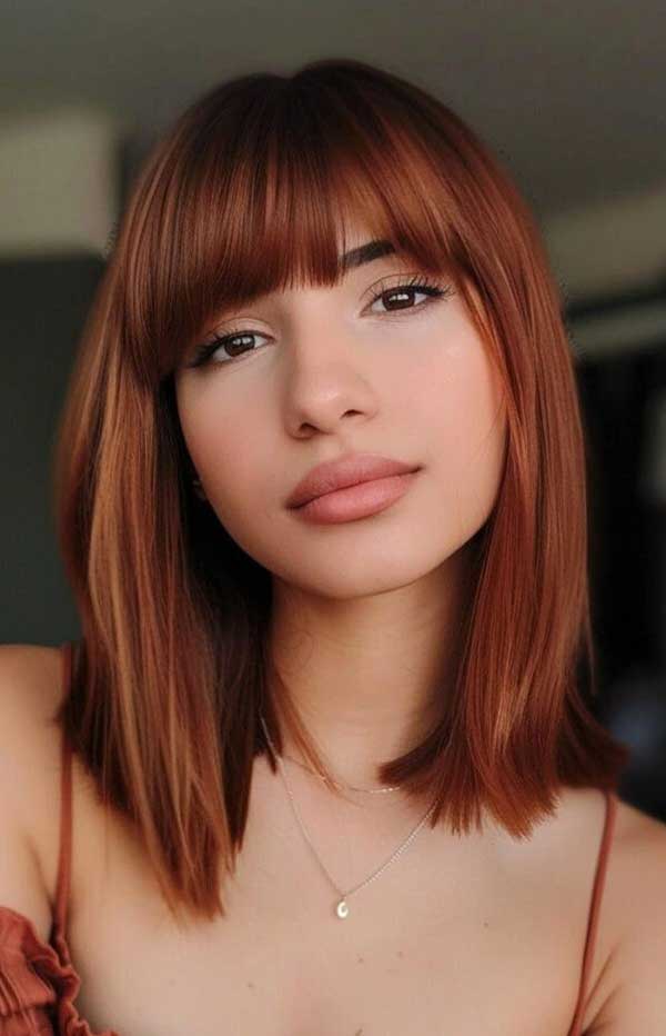 Shoulder-length hair with straight bangs is a clean, modern look with a touch of classic charm. The straight bangs draw focus to the eyes and balance the face while the shoulder-length cut offers versatility and easy styling. This combination suits a variety of hair types and face shapes which makes it a timeless choice for those who want a polished style.