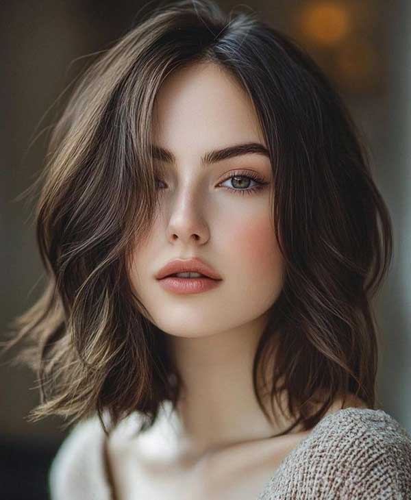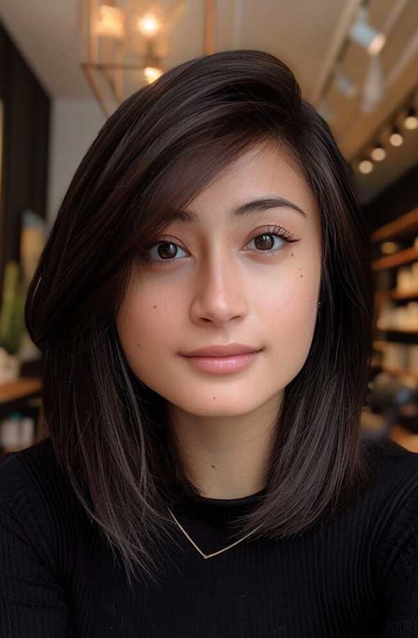 A shoulder-length haircut with a deep side part adds a stylish and flattering twist to a classic cut. The dramatic part creates volume and draws attention to the eyes and cheekbones while giving the hair a fuller and more dynamic appearance. Perfect for anyone wanting a modern, face-framing style that works for both casual and polished outfits.