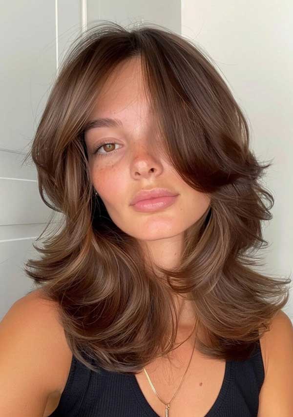 Mid-length layers with side bangs is a stylish, face-framing look that’s both soft and versatile. The layers bring natural volume and texture, adding movement and bounce to the hair while the side bangs create a elegant touch. This cut works beautifully on straight, wavy, or slightly curly hair which makes it an easy-to-style option for anyone wanting a fresh and modern look.