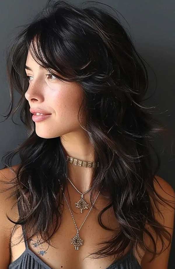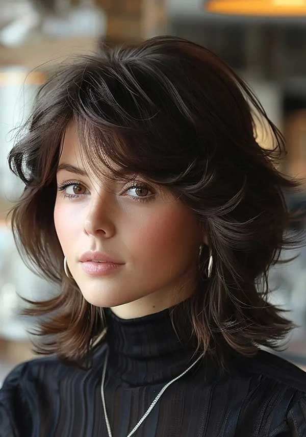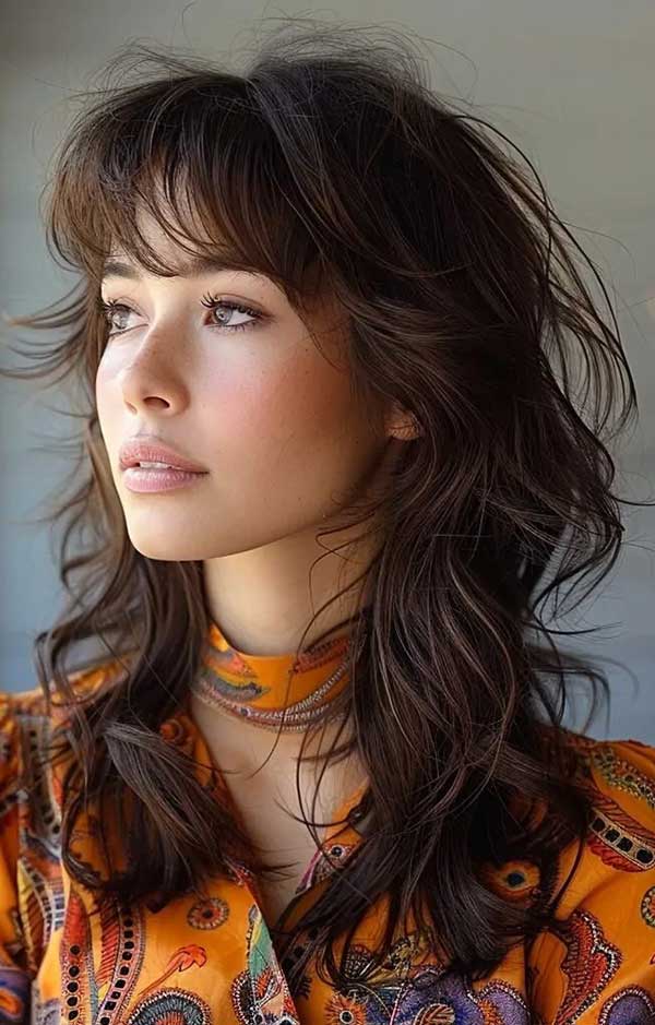 Medium shag with swooping bangs is a chic, dynamic haircut that pairs textured layers with long, sweeping bangs. The bangs elegantly frame the face, adding a touch of softness and drama, while the shag layers create volume and movement. This style works beautifully with both straight and wavy hair, offering a modern, flattering look.