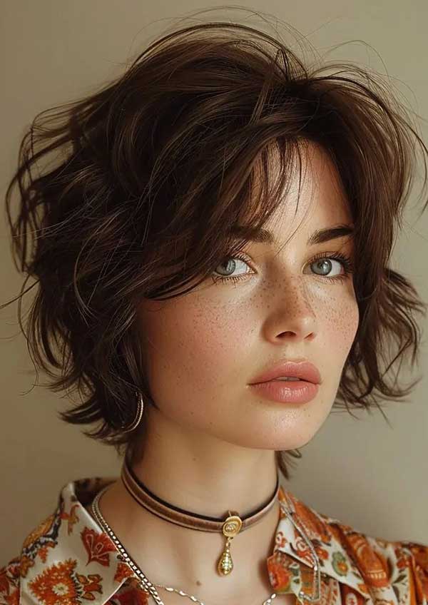Medium shag haircut with choppy bangs is a bold, edgy style that adds instant personality. Featuring layered lengths and uneven, textured bangs, it creates volume and movement while framing the face with a playful touch. This cut works well with wavy or straight hair and suits various face shapes. It’s a great option for those seeking a modern, carefree look that’s both stylish and easy to maintain.