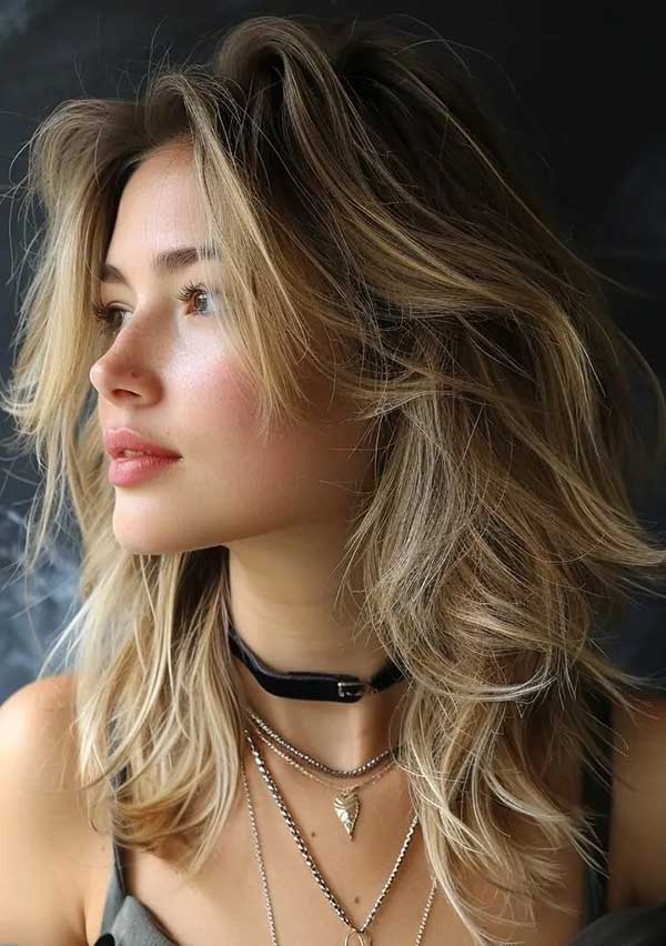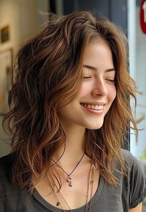 Medium tousled shag with textured ends is a carefree, stylish haircut that combines layers and natural texture for a relaxed, lived-in look. The tousled layers create volume and movement, while the textured ends add a bit of edge. This cut works well with wavy or straight hair, offering an effortlessly chic vibe. Ideal for those wanting a low-maintenance style, the medium tousled shag with textured ends is perfect for everyday wear.