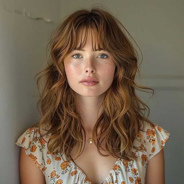 Wavy medium shag with curtain bangs is a trendy, effortlessly cool hairstyle that combines soft waves with layered texture and face-framing bangs. The curtain bangs blend seamlessly into the shaggy layers, enhancing natural movement and volume. Perfect for adding a relaxed, boho vibe, this cut flatters most face shapes and hair types. It’s an ideal choice for those wanting a low-maintenance style with a modern, lived-in finish.