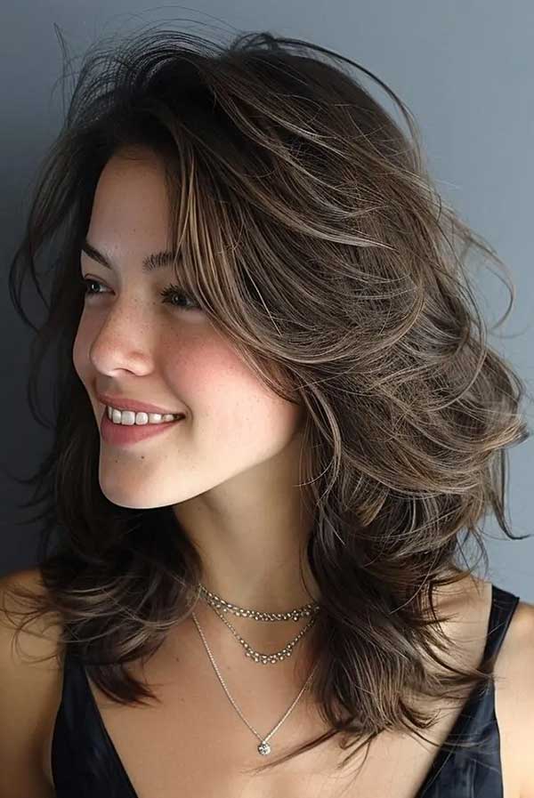 Medium wispy shag with face-framing layers is a light, airy haircut that combines textured layers with soft, face-framing pieces. The wispy layers add movement and volume, while the face-framing strands accentuate the features. This style works beautifully with straight or wavy hair, offering a relaxed yet chic vibe. Ideal for those seeking a low-maintenance, flattering look, the medium wispy shag with face-framing layers creates a soft, feminine finish.