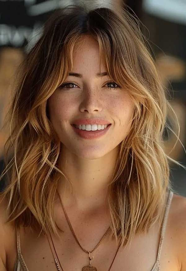 Medium shaggy lob with face-framing Layers is a stylish, low-maintenance haircut that radiates modern charm. Its tousled layers boost volume and texture, while face-framing layers soften features and flatter diverse face shapes. Sitting at or just above the shoulders, this cut suits straight or wavy hair, offering a fresh, effortless vibe. Easily styled, it delivers a polished yet relaxed look with a touch of playful sophistication.
