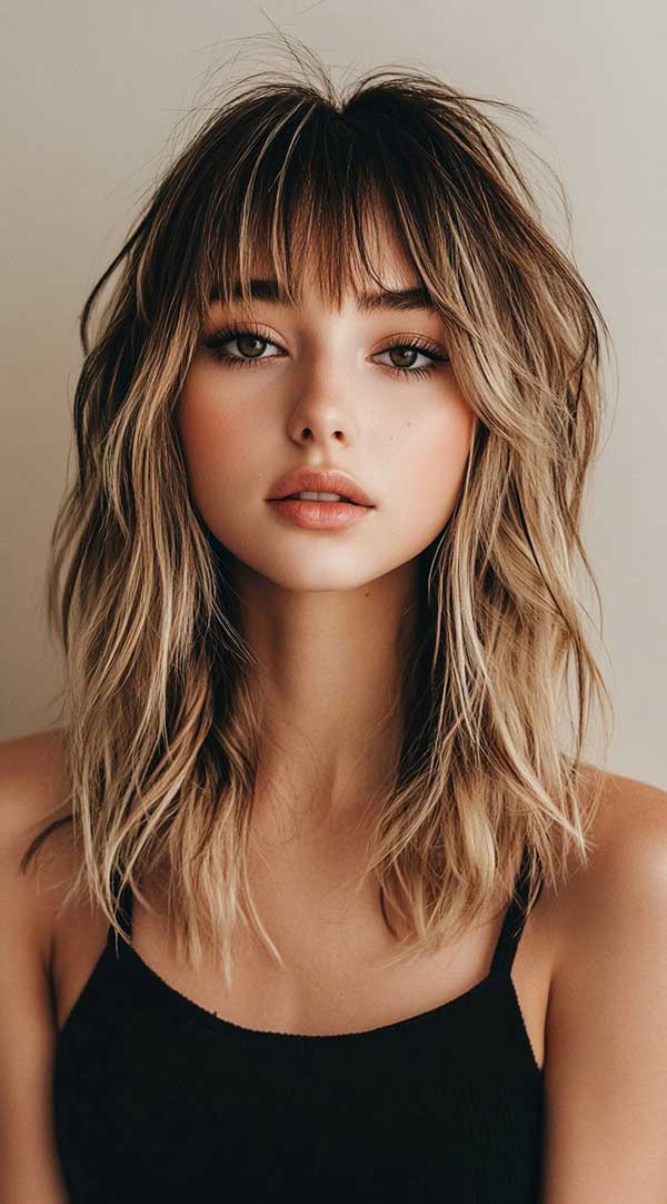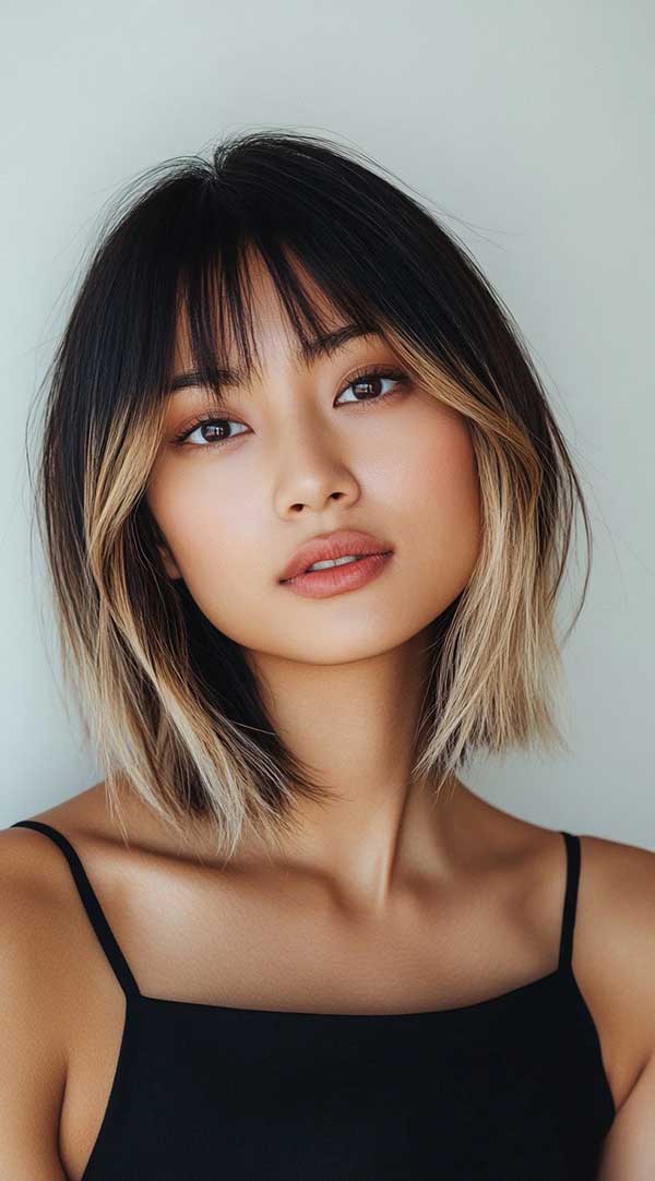 Choppy honey blonde balayage bob with bangs delivers a bold, playful look with warm, golden flair. The choppy layers gain texture as honey blonde highlights brighten the ends, contrasting a darker root. Bangs frame the face, amplifying the edgy vibe. This low-maintenance style shines with movement and shine. Preserve its glow with sulphate-free care and periodic toning, keeping the honey tones fresh and vibrant.