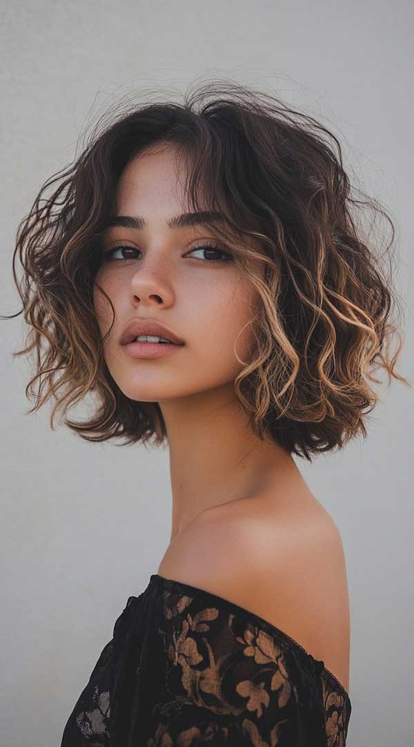 Honey blonde balayage on a textured bob adds a vibrant, multidimensional look that perfectly complements the cut’s edgy style. The golden blonde highlights are subtly blended into the hair, creating a natural, sun-kissed effect that enhances the bob’s movement. This combination of honey tones and texture gives the hair a fuller, more voluminous appearance, making it an ideal low-maintenance yet chic option for those seeking effortless sophistication.