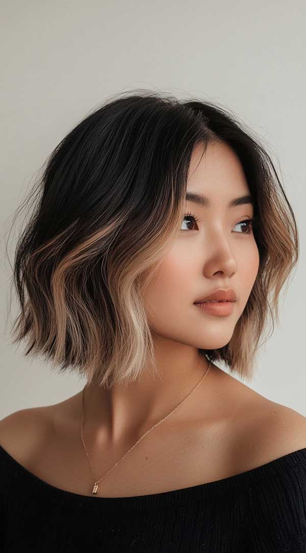 Chin-length bob with honey blonde face-framing highlights creates a fresh, vibrant look. The golden blonde tones subtly brighten the face, adding warmth and dimension to the sleek bob. The short cut enhances the sharpness of the style, while the face-framing highlights soften the overall appearance, giving it a youthful, radiant glow. This low-maintenance yet chic hairstyle is perfect for those wanting a bold, flattering look with minimal upkeep.