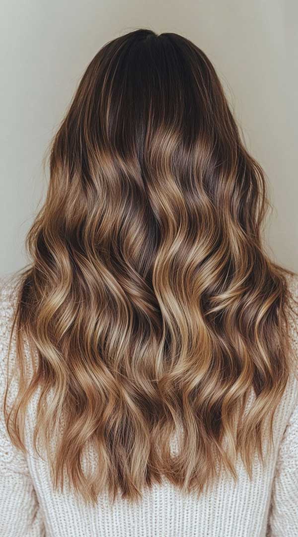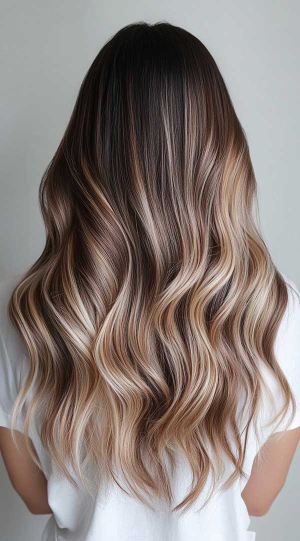Sun-kissed honey blonde balayage on deep brunette hair fuses rich, dark roots with warm, golden streaks for a radiant, natural glow. Starting from a deep brunette base—like chocolate or mahogany—the honey blonde highlights mimic sunlight, brightening the ends with a soft fade. This low-maintenance style adds dimension and warmth, flattering diverse tones. Preserve its luster with sulfate-free care and periodic toning, ensuring a fresh, effortless look.