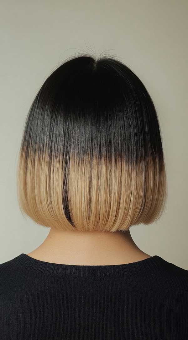 Honey blonde ombré on a blunt cut bob creates a striking, modern contrast. The rich, dark roots gradually transition into soft golden blonde at the tips, highlighting the sharp, clean lines of the bob. This style adds warmth and dimension, while the ombré effect brings depth to the straight cut.