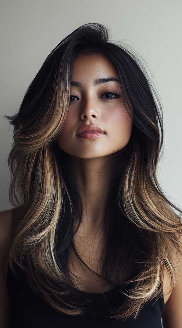 Long feathered layers with honey blonde balayage create a soft, flowing look with natural volume. The honey blonde highlights are seamlessly blended into the layers, adding depth and dimension while brightening the hair. The feathered layers enhance the hair’s movement, giving it a light, airy feel. This effortless, sun-kissed style adds a radiant glow, perfect for those looking for a low-maintenance, glamorous hairstyle with plenty of texture and flow.