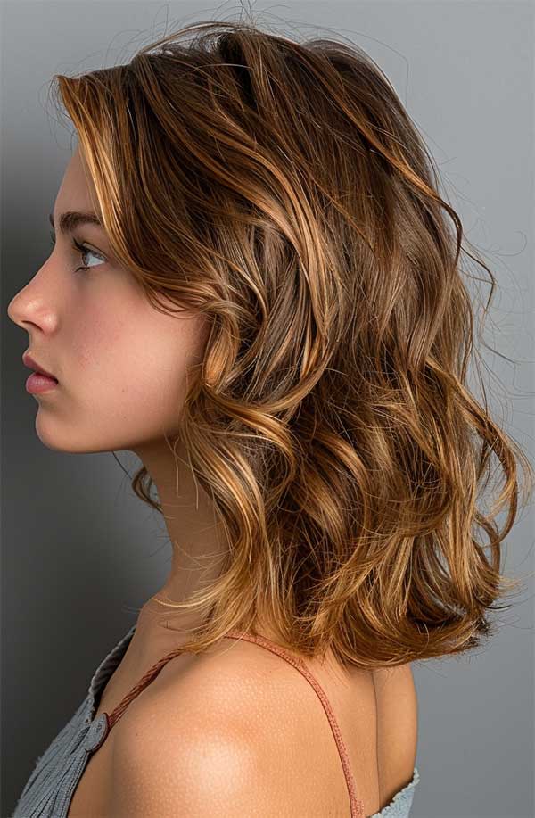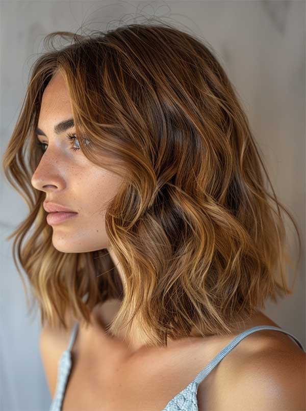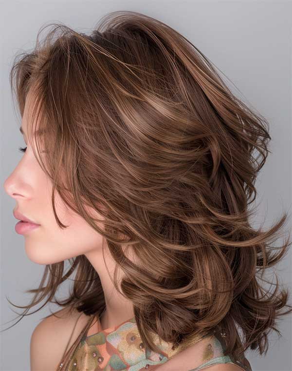 Medium haircut with beachy layers creates a relaxed look inspired by sun-kissed waves. Perfect for wavy or slightly curly hair, this style enhances volume and body while maintaining a casual, laid-back vibe. It’s a versatile, low-maintenance choice that brings a fresh, summery touch to medium-length hair.