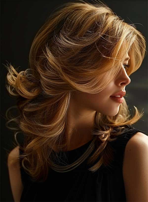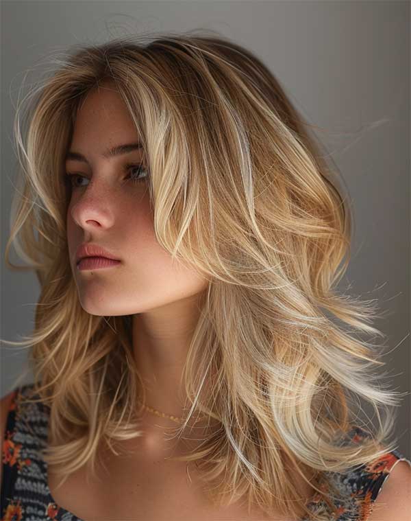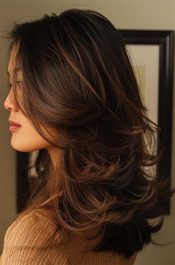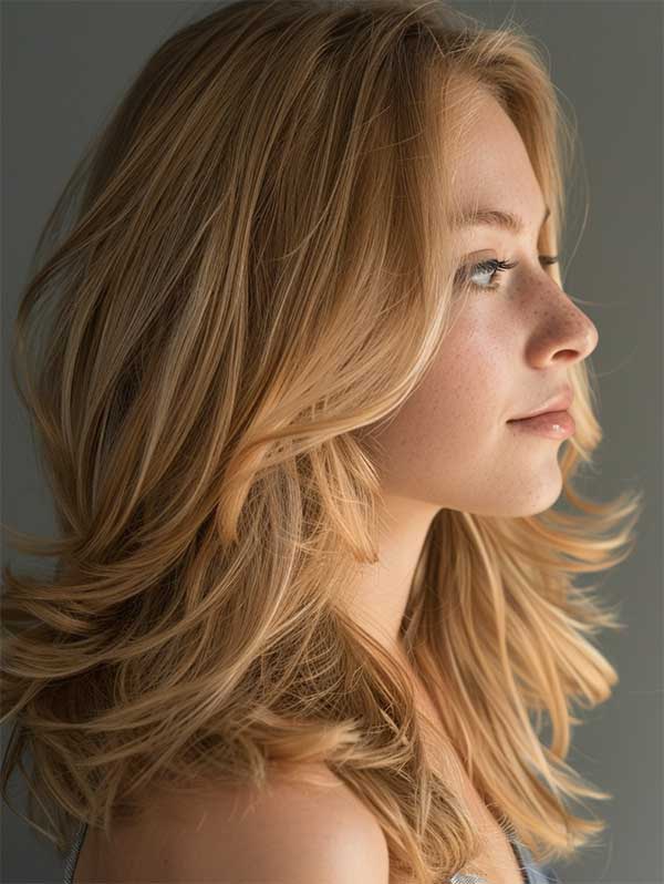 A medium layered haircut with feathered layers offers a light and airy texture that adds gentle movement to your hair. The softly tapered ends create a wispy, natural finish that beautifully frames the face. It’s a classic, elegant look that feels fresh, making it perfect for anyone seeking a modern breezy hairstyle.