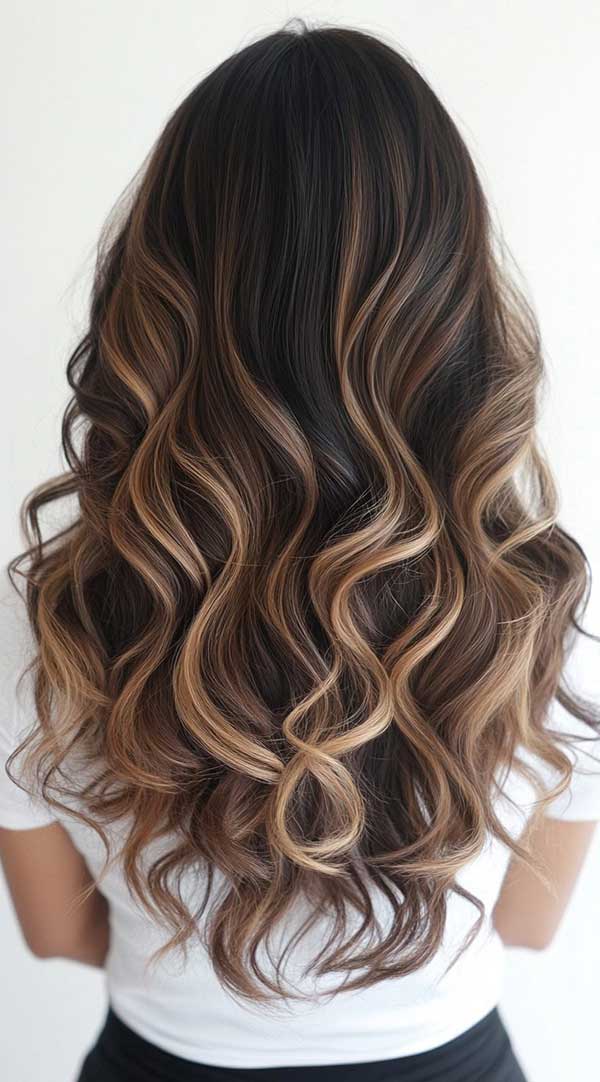 Curly golden brown balayage with caramel highlights creates a warm, dimensional look full of depth and vibrancy. The balayage technique blends golden brown tones seamlessly, while caramel highlights add a sun-kissed glow that enhances natural curls. This combination brings out movement, shine, and richness, making curls appear more defined and voluminous. Perfect for a radiant, low-maintenance style, this balayage look exudes warmth, elegance, and effortless beauty.