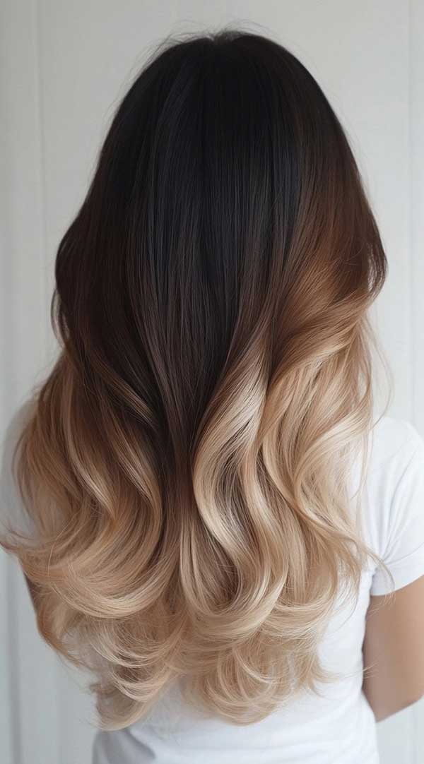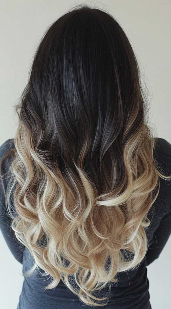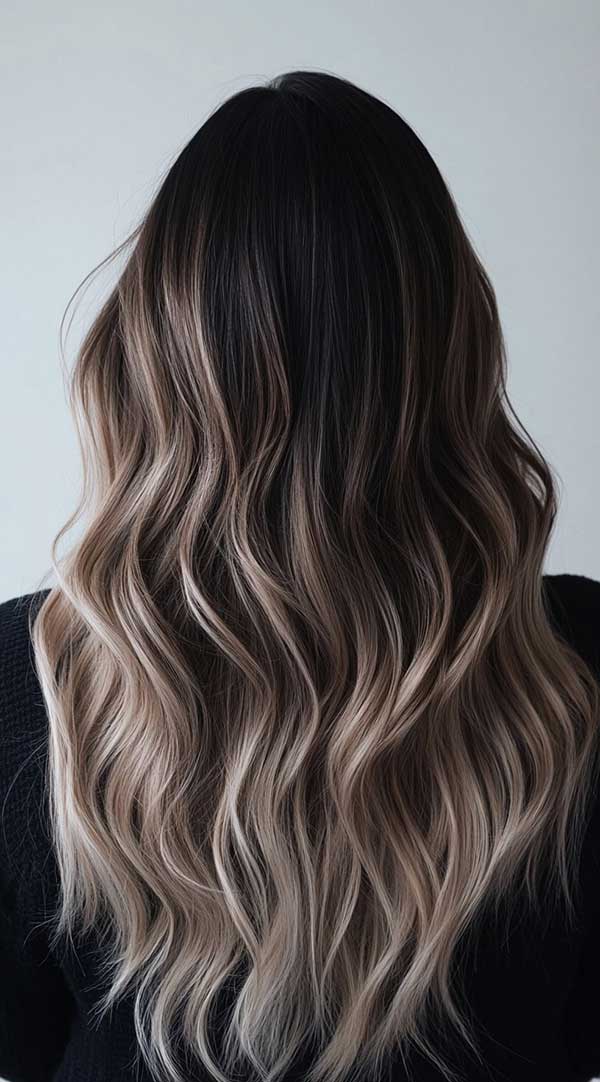 Dark chocolate to icy blonde ombre balayage creates a striking contrast with a seamless gradient effect. This technique transitions from rich, deep brown roots to cool, icy blonde ends, adding depth and dimension. The balayage blending ensures a natural, low-maintenance grow-out while enhancing shine and texture. Perfect for bold yet sophisticated looks, this color transformation offers a modern, edgy style with a soft, effortless flow of color.