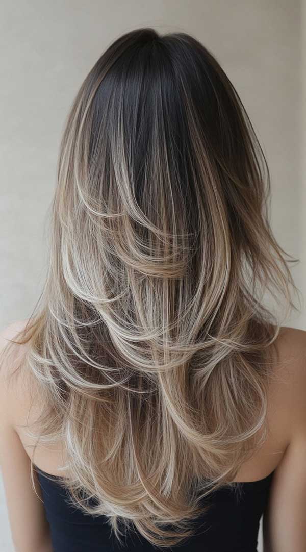 Layered beige blonde balayage with feathered ends creates a soft, elegant look with natural movement and dimension. The balayage technique seamlessly blends warm and cool beige tones, enhancing depth while keeping the transition smooth and effortless. Feathered ends add a light, airy feel, making the layers appear more voluminous and textured. Perfect for a sophisticated yet low-maintenance style, this balayage offers a timeless, polished finish with a modern touch.