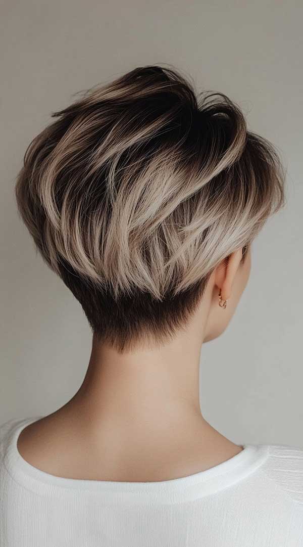 Layered pixie with blonde balayage adds dimension, texture, and brightness to a short, chic style. The hand-painted blonde highlights blend seamlessly with the natural base, enhancing depth and movement. Layers create volume and definition, giving the pixie cut a modern, dynamic look. This low-maintenance yet stylish balayage technique brings a fresh, sun-kissed effect, making the pixie cut appear effortlessly edgy, vibrant, and full of character.