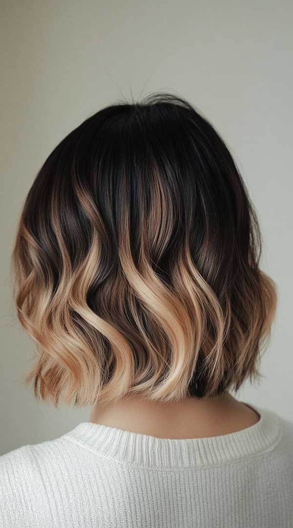 Warm caramel blonde balayage on a short wavy bob creates a soft, sun-kissed look with rich dimension. The hand-painted caramel and blonde tones blend seamlessly, enhancing the bob’s movement and texture. The warm hues add depth, making waves appear more defined and voluminous. This low-maintenance yet stylish balayage is perfect for a fresh, radiant glow, giving the short bob a chic, effortless, and modern appeal with a touch of warmth.