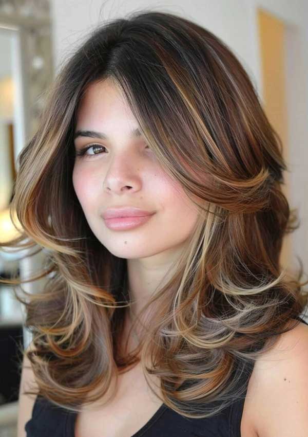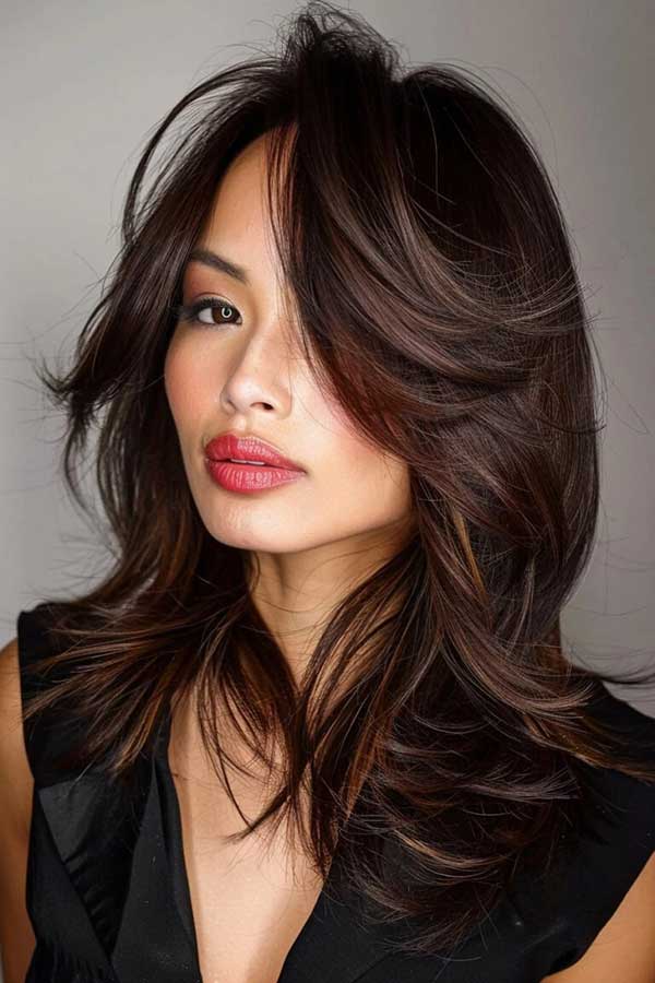 The airy layers of the butterfly cut add volume and flow while the delicate blonde streaks enhance texture and brightness without overpowering the base color. This look is perfect for adding a touch of light and movement to darker hair.
