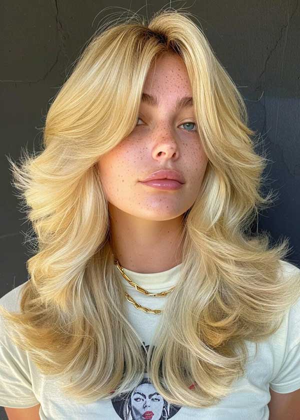 Golden blonde butterfly haircut with soft layers is a luminous, airy style that combines warmth with graceful movement. The golden blonde tones add a radiant, sunlit glow while the soft cascading layers create gentle volume and flow. This flattering cut frames the face beautifully and enhances natural texture while giving the hair a breezy feel.