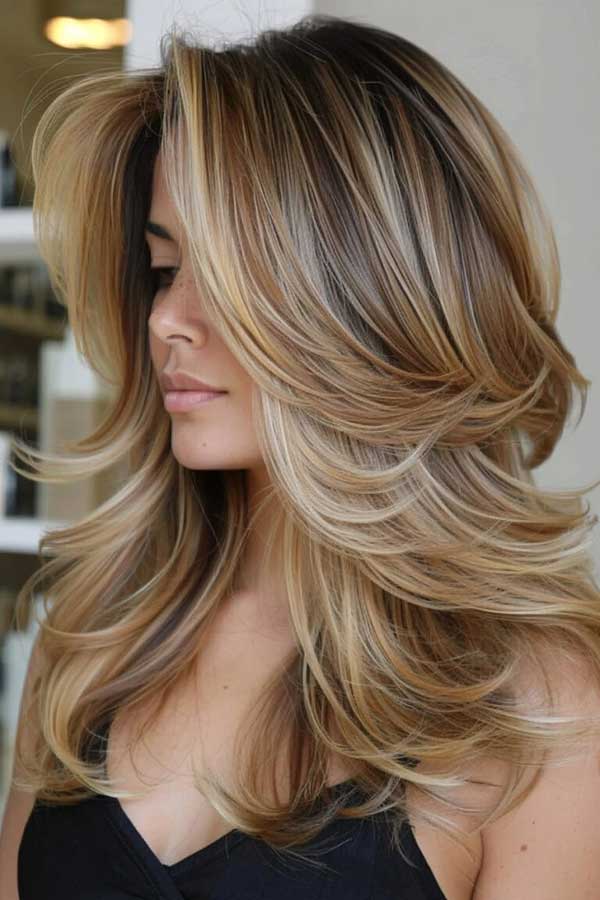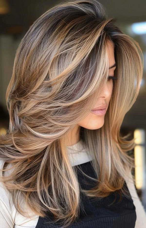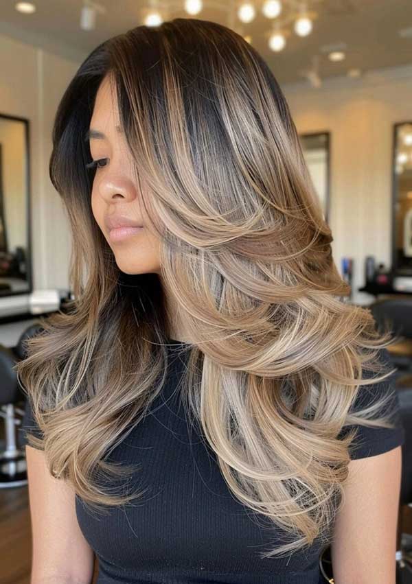 A long butterfly haircut with beige blonde balayage blends effortless elegance with soft and dimensional color. The cascading layers create natural volume and movement while the beige blonde tones add a sun-kissed glow. This balayage technique enhances the flow of the layers while giving the hair a seamless, airy look.