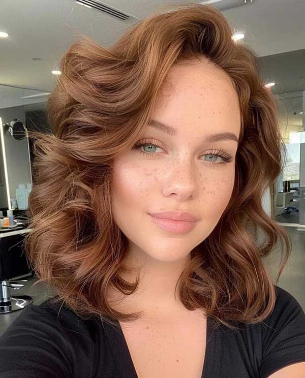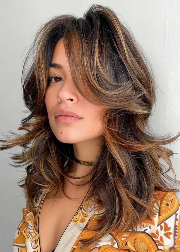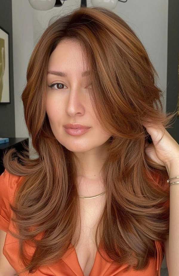 This cut’s soft face-framing layers create volume and bounce while the copper tones add a sunlit glow. These warm highlights enhance the texture of the layers while making each strand stand out.