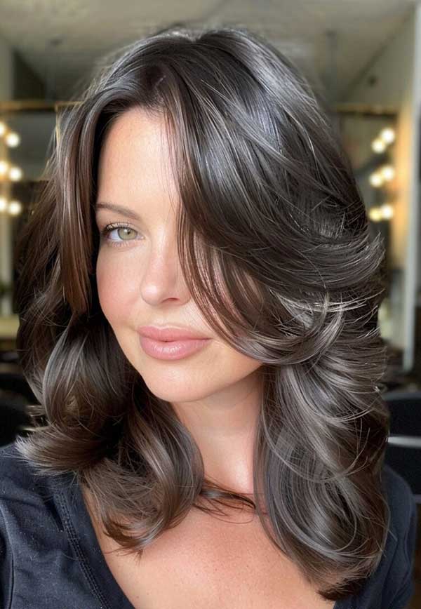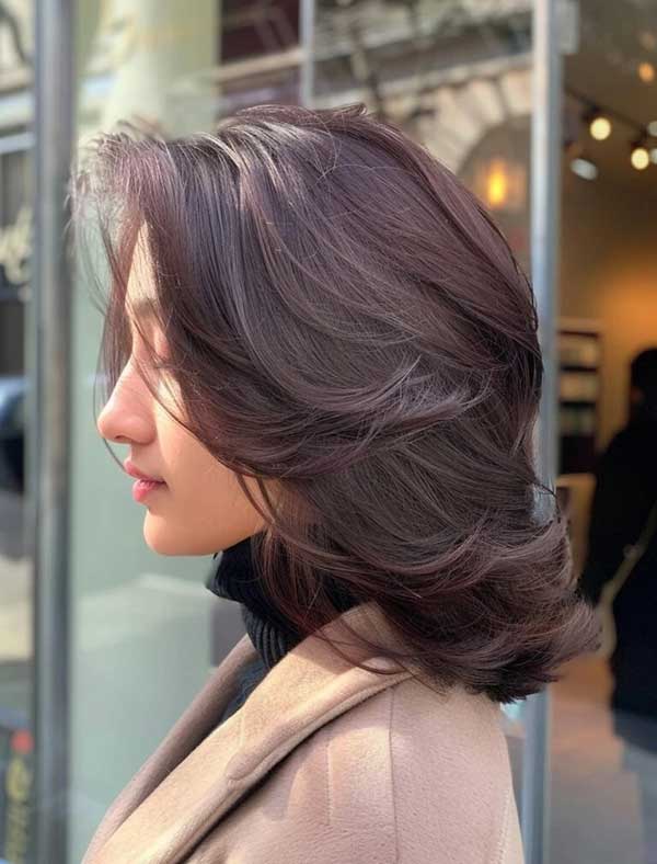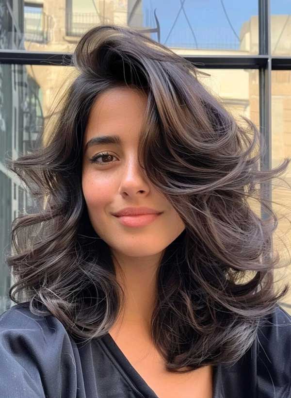 The dark brown butterfly haircut with voluminous layers is a rich style that adds depth and movement to your look. The deep brown hue enhances shine while the layered cut lifts the hair and creates full-bodied volume. Face-framing layers soften the look while giving it a flattering, airy shape.
