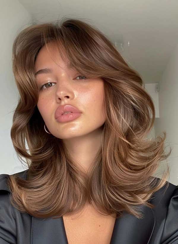 Medium length butterfly haircut is a versatile style that combines soft layering with a balanced silhouette. It adds volume and movement without sacrificing length while featuring shorter layers around the face and longer ones beneath.