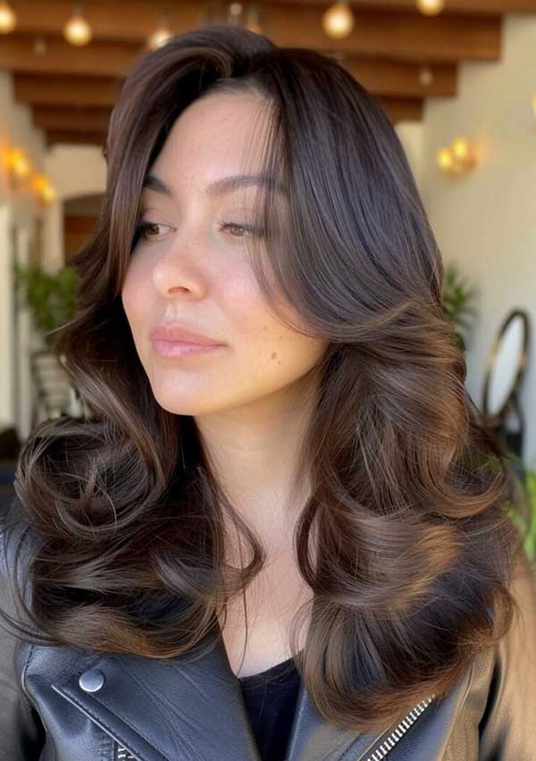 The deep brunette base adds depth and shine while the airy, cascading layers create movement and body. This haircut lifts the hair at the crown and frames the face beautifully while giving a soft and dramatic effect.