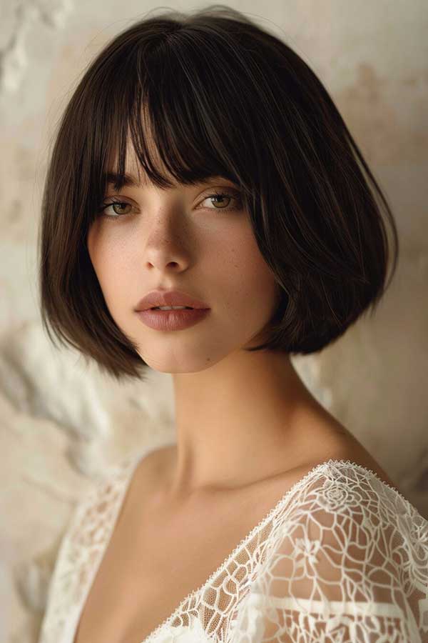 Blunt bob with swoopy bangs is a chic and sophisticated hairstyle that combines sharp structure with soft movement. The blunt cut creates a sleek, polished look, while the swoopy bangs add volume and frame the face beautifully. This style works well for various hair textures, offering a timeless yet modern appeal. Perfect for those seeking an elegant, low-maintenance cut, this bob enhances facial features and exudes effortless sophistication.