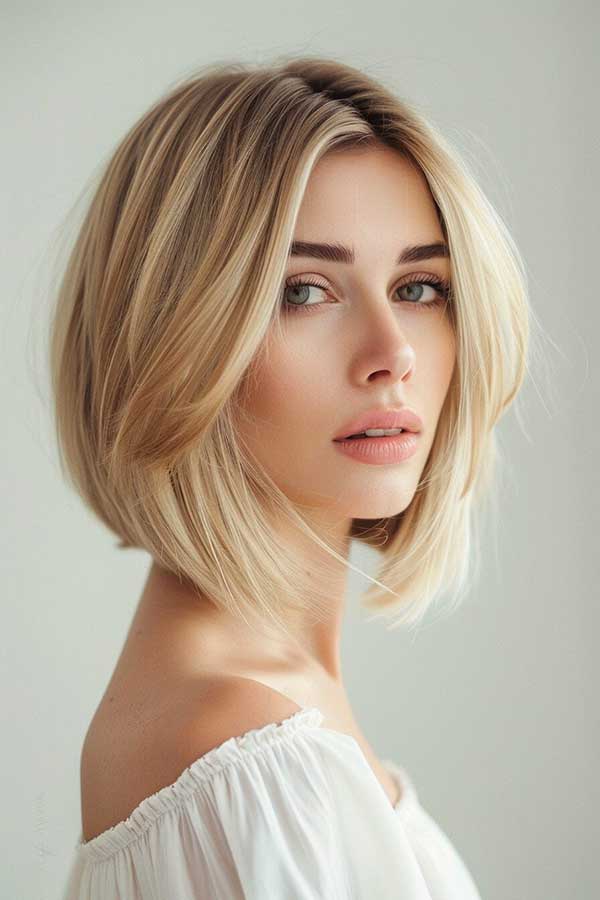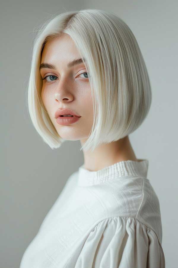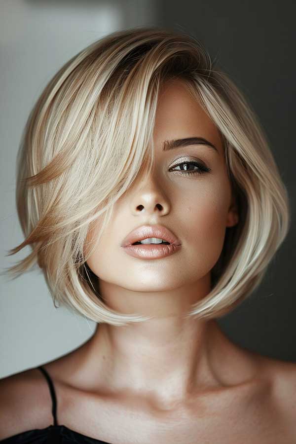Bright blonde bob cut is a stylish, eye-catching hairstyle that enhances volume and radiance. The bold blonde shade adds vibrancy, making hair appear fuller and more dynamic. This classic cut, whether blunt or slightly layered, frames the face beautifully and works well with various textures. Sleek and polished or tousled for a modern touch, a bright blonde bob offers a fresh, youthful, and effortlessly chic look.