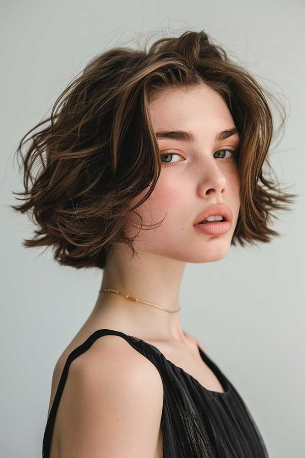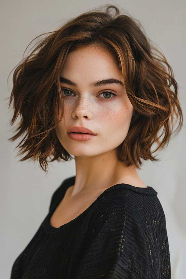 Short textured bob with highlights is a trendy and versatile hairstyle that adds depth and movement. The textured layers create a lightweight, tousled effect, while the highlights enhance dimension and brightness. This chic cut flatters various face shapes and works well with both sleek and messy styles. Low-maintenance yet stylish, the short textured bob with highlights offers a fresh, modern look that exudes effortless charm and sophistication for any occasion.