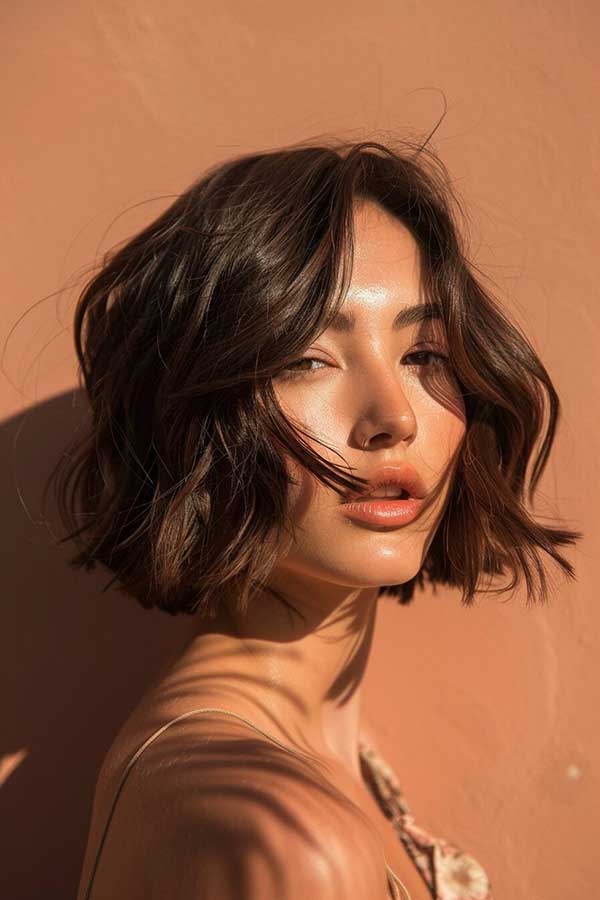 Short bob with textured ends is a trendy and effortless hairstyle that adds movement and volume. The textured ends create a soft, tousled effect, making the hair appear fuller and more dynamic. This versatile cut works well with both straight and wavy styles, offering a relaxed yet polished look. Perfect for those seeking a modern, low-maintenance haircut, this bob exudes a fresh, chic, and youthful vibe for any occasion.