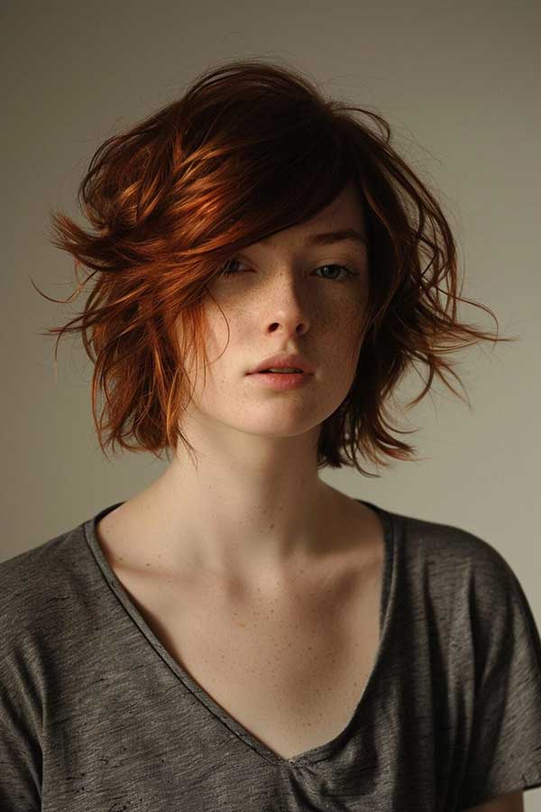 Short shaggy bob with bangs is a trendy, carefree hairstyle that adds texture and movement. The choppy layers create a tousled, voluminous effect, while the bangs frame the face for a youthful, edgy look. This versatile cut works well with various hair types and can be styled messy or polished. Effortlessly stylish and low-maintenance, the short shaggy bob with bangs is perfect for a modern, playful, and bold appearance.